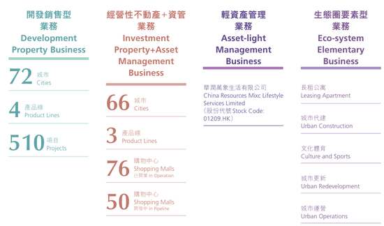 目前的华润置地共有四大业务条线,分别是开发销售型业务、经营性不动产+资管业务、轻资产管理业务和生态圈要素型业务。