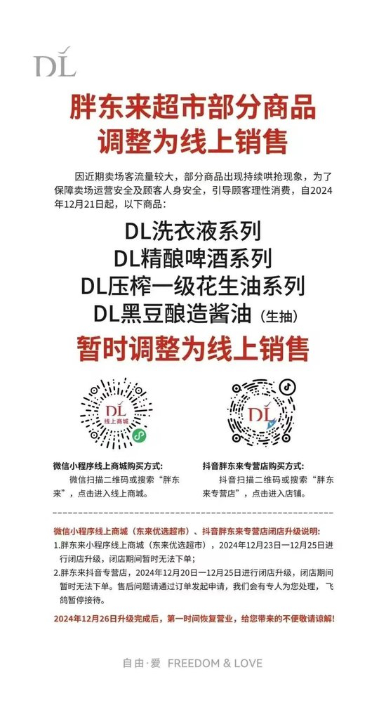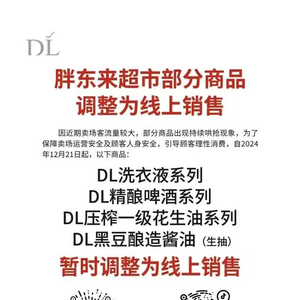 胖东来公告称,因近期卖场客流量较大,部分商品出现持续抢购现象,为了保障卖场运营安全及顾客人身安全,引导顾客理性消费,自2024年12月21日起,DL洗衣液系列、DL精酿啤酒系列、DL压榨一级花生油系列、DL黑豆酿造酱油(生抽)等商品暂时调整为线上销售。