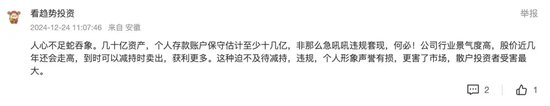 有投资者表示:“人心不足蛇吞象……非那么急吼吼违规套现,何必!……这种迫不及待减持,违规,个人形象声誉有损,更害了市场,散户投资者受害最大。”