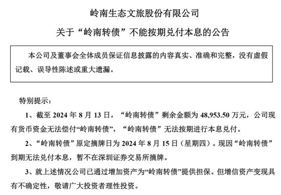 今年8月14日晚,岭南股份公告称,截至2024年8月13日,“岭南转债”剩余金额为4.89亿元,公司现有货币资金无法偿付“岭南转债”,“岭南转债”无法按期进行本息兑付。