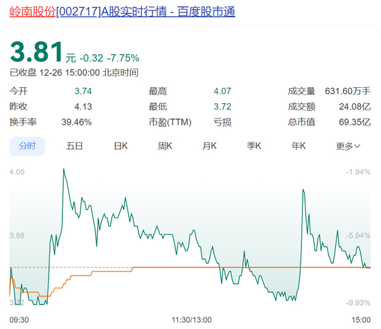 半年股价涨了600%的“大牛股”岭南股份(002717.SZ),本周突然连续3天跌停!26日,其又几度在跌停边缘挣扎,最终收跌7.75%,近4个交易日股价跌了近三分之一。