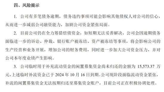公司临时用于补充流动资金的闲置募集资金尚未归还的金额为1.56亿元,上述临时补流资金已于10月16日到期。公司现阶段面临流动资金紧张,补流的闲置募集资金无法按期归还至募集资金账户,目前公司正在积极协调处理。
