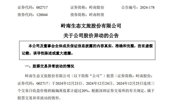 12月25日晚,岭南股份发布股价异动公告,公告中提到,公司有多笔债务逾期,债务违约事项可能会影响其他债权人对公司的信心,从而进一步减弱公司融资能力,加剧公司资金紧张局面。