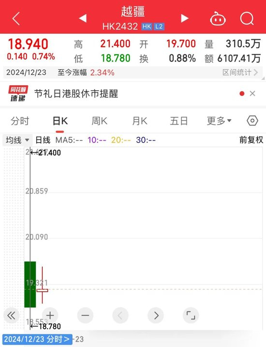 发行价与募资总额似乎并未让越疆科技的投资者们喜出望外。上市首日开盘后,越疆科技高开低走,开盘报19.70港元,盘中最低价报18.78港元,一度跌破发行价,最终收报18.94港元,涨幅仅为0.74%。与诸多上市公司追求的首日“开门红”相比,越疆科技的这一涨幅显得有些平淡。
