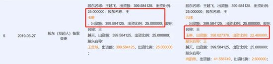 到了2019年,尚韵思加入王越科王出资人队列,其出资额约41.56万元,出资比例2.6%。有意思的是,尚韵思注资后,王越科王注册资本总额没有变化,而是王玉琳(曾是尚韵思的婆婆)的出资减少了约41.56万元,出资比例由25%下降至22.4%。