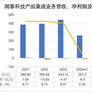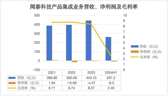 2022年和2023年,产品集成业务净亏损分别为4.47亿元和15.69亿元。今年上半年,尽管这一业务收入同比增长26.68%达到261.2亿元,但净利润却大幅亏损8.5亿元。