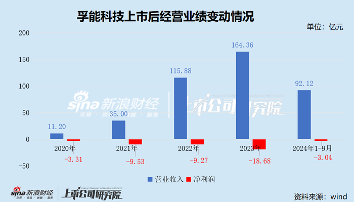 上市当年,孚能科技营业收入就出现“腰斩”,净亏损额达到了3.31亿元,是上市前4年累计净利润的4倍还多。2020年—2023年,公司营业收入“狂飙”,从11.2亿元增长至164.4亿元,年复合增长率高达144.85%。伴随而来的却是不断扩大的亏损规模,上市4年来累计亏损超40亿元。