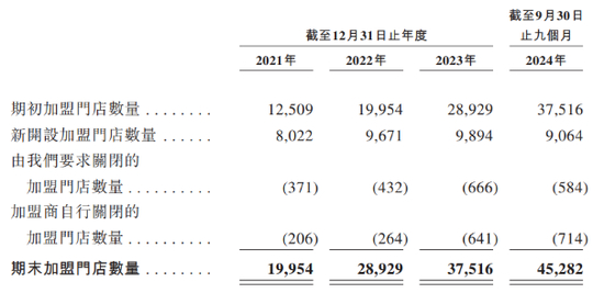 产品平价是蜜雪冰城受消费者欢迎的原因之一,其核心产品的价格通常为2元至8元,蜜雪冰城也在招股书中提到,提供高质平价的产品是公司的价值主张。报告期内,公司门店数量增加迅猛,截至2024年9月30日,蜜雪冰城通过加盟模式发展的门店网络在中国和海外共有45302家门店,其中,超过99%的门店为加盟门店。