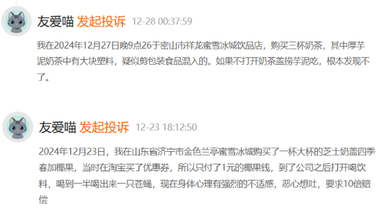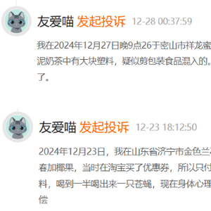 但证券之星却发现,加盟店数量激增之下,消费者对蜜雪冰城的投诉也在增长。在某投诉平台,有关蜜雪冰城门店的产品质量问题被消费者们屡屡提及。比如在2024年12月28日,有消费者投诉称,“其于12月27日在密山市祥龙蜜雪冰城饮品店,购买三杯奶茶,其中厚芋泥奶茶中有大块塑料,疑似剪包装食品混入”,另有消费者在12月23日发起投诉称,在蜜雪冰城购买了一杯大杯的芝士奶盖四季春加椰果,喝到一半喝出一只苍蝇。