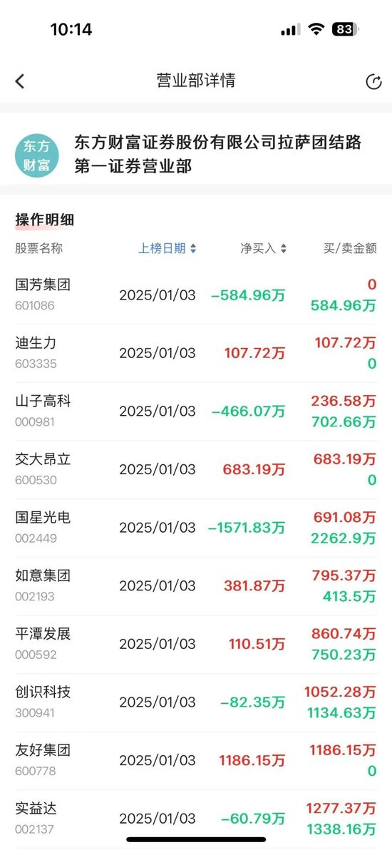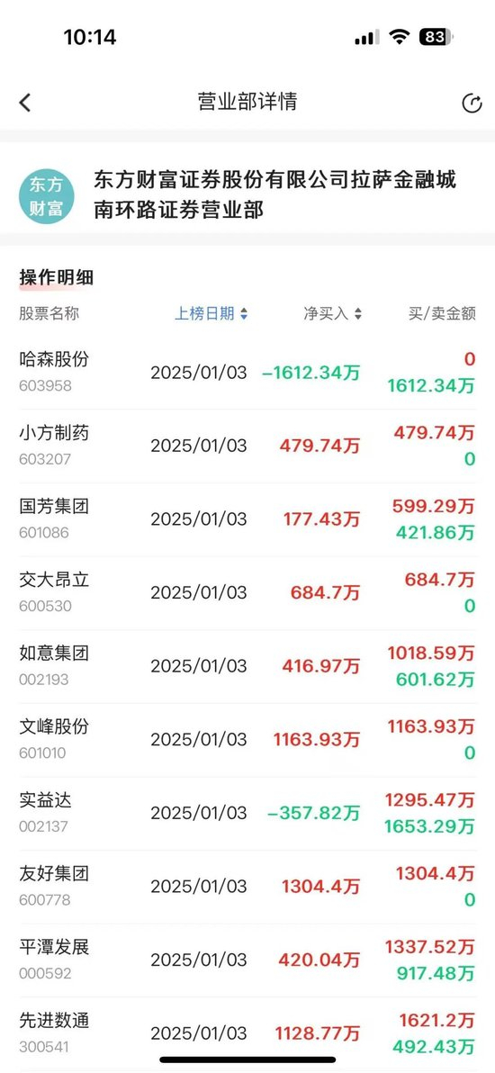 同时,1月3日东方财富证券拉萨金融城南环路证券营业部净买入1163.93万的文峰股份,今日文峰股份大跌10%;净买入5115.04万莲花控股,莲花控股今日10cm跌停;净买入华联股份1521.41万,华联股份今日10cm跌停;净买入中百集团2217.04万,中百集团今日同样跌停;净买入6036.72万的益民集团今日小涨3.14个点。