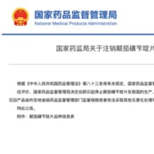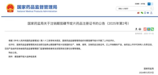 2025年1月3日,国家药监局发布公告称,决定自即日起停止颠茄磺苄啶片在我国的生产、销售、使用,注销药品注册证书。公告附件显示,此次注销共涉及颠茄磺苄啶片的80个生产批号。