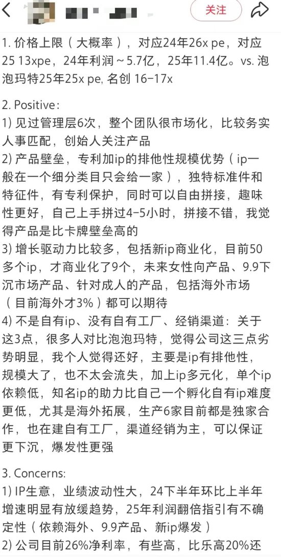 不过,也有小红书博主表示,布鲁可没有自有核心IP、工厂和经销渠道,这三点常被拿来与泡泡玛特对比,认为是其明显的劣势。但布鲁可的优势在于IP的排他性和多元化,依赖单一IP的风险较小。随着公司规模的扩大,IP的流失概率也更低。而且,借助知名IP的影响力,拓展海外市场的难度要比孵化自有IP更低。