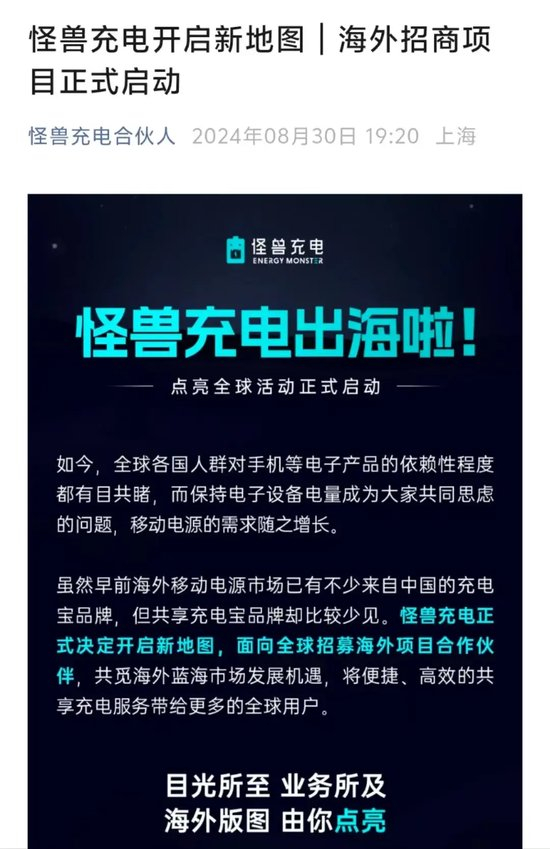 2024年8月,怪兽充电在公众号“怪兽充电合伙人”宣布,全球对移动电源的需求在增长,怪兽充电正式决定开启新地图,面向全球招募海外项目合作伙伴。