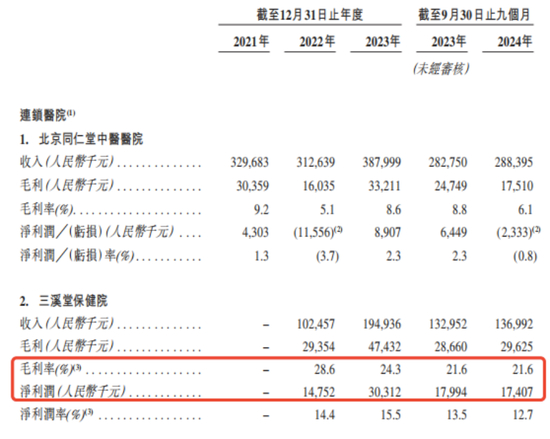 也就是说,同仁堂扭亏为盈的2023年,三溪堂保健院的净利润3031.2万元就占其总体净利润的67.94%。另一家三溪堂国药馆2023年的净利润为1642.4万元,占其总体净利润的36.83%。两者相加相当于同仁堂医养2023年总体净利润的104.77%。