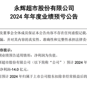 1月14日晚间,永辉超市发布业绩预告,预计2024年净亏损14亿元,扣除非经常损益后净亏损22.1亿元。