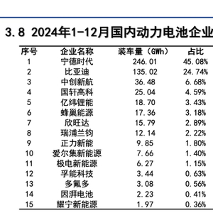 从规模最大的动力电池看,2024年头部企业竞争格局相对稳固,装车量前五大公司中,宁德时代和国轩高科表现更优,与上年相比,市占率分别增加1.89和0.48个百分点,市场份额进一步提升。