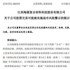 海源复材称,结合公司2024年度业绩预告情况,根据相关规定,在公司2024年年度报告披露后,公司股票交易将可能被实施退市风险警示。