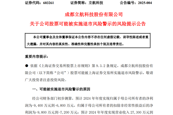 立航科技表示,经公司财务部门初步测算,预计2024年年度实现归属于母公司所有者的净利润为-9400万元至-6800万元,归属于母公司所有者的扣除非经常性损益后的净利润为-9800万元至-7200万元;预计2024年年度实现营业收入2.73亿元到2.93亿元,扣除与主营业务无关的业务收入和不具备商业实质的收入后的营业收入为2.7亿元到2.9亿元,低于3亿元。