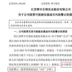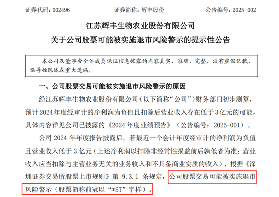 1月22日,辉丰股份发布公告称,经财务部门初步测算,预计公司2024年度经审计的净利润为负值,且扣除后营业收入存在低于3亿元的可能。