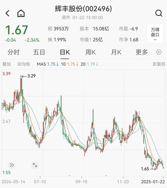 截至1月22日收盘,辉丰股份报1.67元/股,总市值为25亿元。