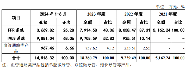 招股书显示,截至招股说明书签署日,北芯生命共有9个商业化产品,核心产品包括心血管介入医疗器械产品FFR系统及IVUS系统。从收入结构看,FFR系统和IVUS系统收入占公司总营收的比重保持在95%左右,为公司业务基本盘。