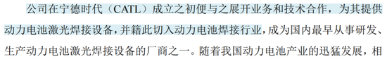 公司在宁德时代成立之初便与之开展合作,为其提供动力电池激光焊接设备,并由此切入动力电池焊接行业。