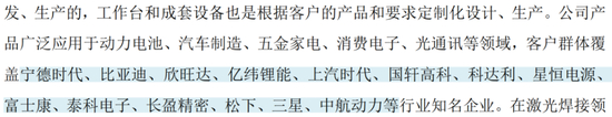 公司产品广泛应用于动力电池、汽车制造、消费电子、光通讯等领域,客户包括宁德时代、比亚迪、欣旺达、国轩高科、泰科电子、松下、三星等。