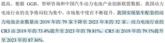 近年来,我国动力电池行业集中度持续提升,2019-2023年,CR3由73.4%提升至78.8%。2023年,宁德时代动力电池国内市占率为44.5%,连续7年位列第一。