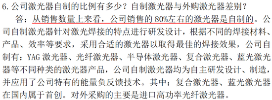 目前,公司销售的80%左右的激光器是自制的,但高功率光纤激光器仍需要进口。