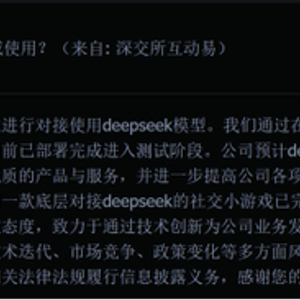 对此,盛天网络于2月5日在投资者互动平台回应称,公司目前正在进行对接使用Deepseek模型,预计该模型后续可应用于旗下社交产品带带电竞和给麦,以提高公司各项业务生产力。同时,盛天网络提到,公司一款底层对接DeepSeek的社交小游戏已完成了一轮内部测试。