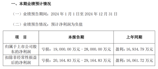 业绩层面而言,据2024年度业绩预告显示,公司预计2024年归母净利润亏损金额在1.9亿元至2.8亿元,扣非净利润亏损金额在2.02亿元至2.92亿元,同比均由盈转亏。