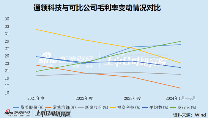 更令人起疑的是,近年来,可比公司的综合毛利率普遍下滑,而通领科技却能实现逆势增长。报告期内,可比公司的平均毛利率分别为24.79%、23.20%、23.59%、21.86%,通领科技的毛利率分别为20.81%、23.24%、26.39%和28.95%,近两年显著高于可比公司。