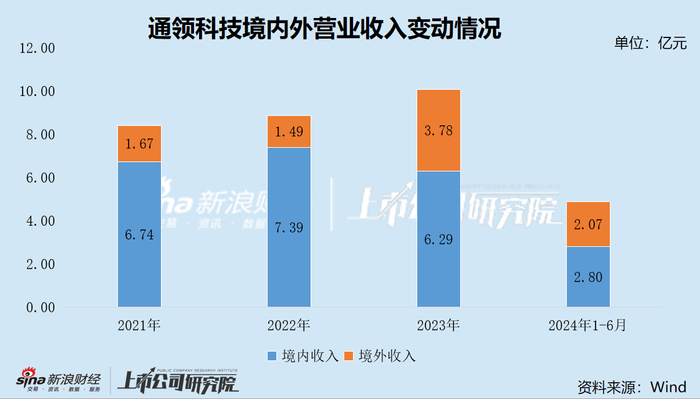 报告期内,公司境外收入金额分别为1.67亿元、1.49亿元、3.78亿元和2.07亿元,占营业收入的比例分别为19.81%、16.74%、37.56%和42.52%,2023年境外收入大幅增长,境内收入则同比下滑。