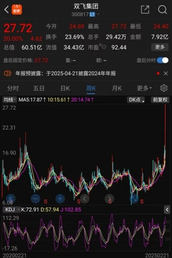 截至收盘,沪指涨0.85%,深成指涨1.82%,创业板指涨2.51%。当日10时36分,双飞集团股价冲至27.72元,较前一交易日收盘价上涨20.00%,成功触及涨停板。2月20日,该股也以涨停收盘。