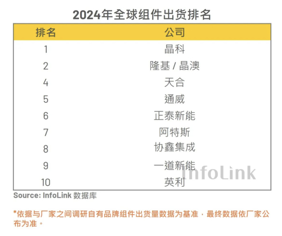 据晶澳科技披露,截至2024年年底,公司组件产能将超100GW,硅片与电池产能达组件产能的80%。在行业机构InfoLink发布的2024年全球组件出货排名中,晶澳科技与隆基绿能并列全球第二,与2023年的排名第四相比有所上升。