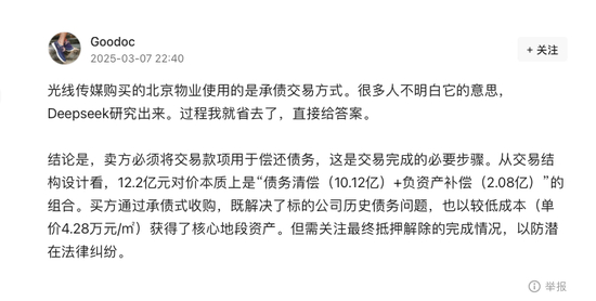 也有网友针对此次光线传媒的交易指出,“从交易结构设计看,12.2亿元对价本质上是“债务清偿(10.12亿)+负资产补偿(2.08亿)”的组合。买方通过承债式收购,既解决了标的公司历史债务问题,也以较低成本(单价4.28万元/㎡)获得了核心地段资产。但需关注最终抵押解除的完成情况,以防潜在法律纠纷。”