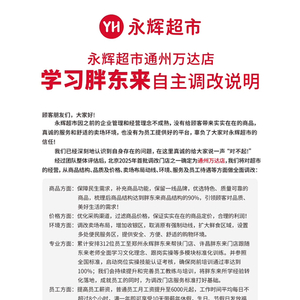 调改说明显示,经过团队整体评估后,永辉超市将通州万达店定为在北京的首批调改门店之一,他们将对超市的经营进行全面调改,包括商品结构、品质及价格、卖场布局动线、环境、服务及员工待遇等。