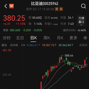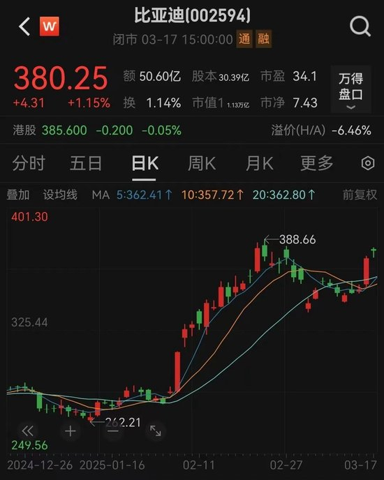 3月17日,比亚迪股价以380.25元/股报收,最新市值为1.13万亿元。