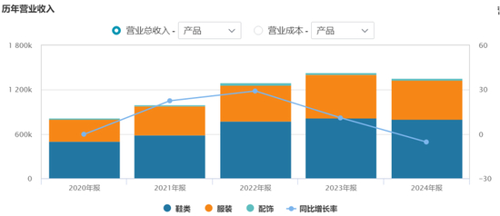 2023年,鞋类收入81.72亿元,收入占比57%,同比增长5.3%,增速大幅落后服装业务,与集团整体营收增速10.9%相比,也有较大差距。2024年报中没有提及鞋类业务增速的数据。