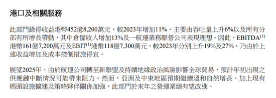 其中备受关注的港口及相关服务部门取得营收452.82亿港元,较2023年增加11%,主要由吞吐量上升6%以及所有分部有所增长带动,其中仓储收入增加13%及一航运业务联营公司表现理想。