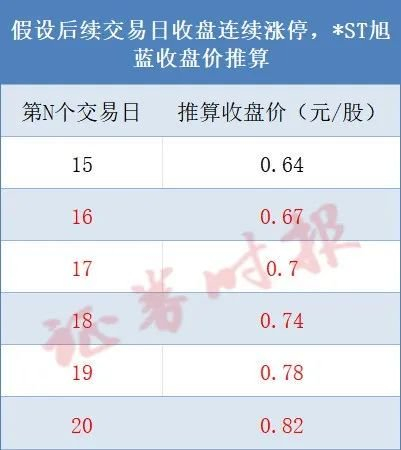记者测算发现,即便后续5个交易日连续涨停,*ST旭蓝股价也回不到1元以上,从而将触及连续20个交易日的股票收盘价均低于1元的面值退市标准。