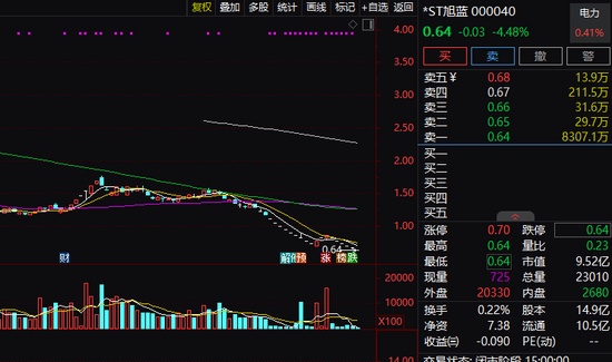 3月24日,*ST旭蓝再度跌停,股价报0.64元/股,这是该股连续第15个交易日收盘价低于1元。根据《深圳证券交易所股票上市规则(2024年修订)》(以下简称《股票上市规则》)第9.2.1条、第9.1.15条相关规定,在深交所仅发行A股股票的公司,通过深交所交易系统连续20个交易日的股票收盘价均低于1元,深交所终止其股票上市交易。