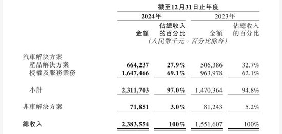 具体来看,公司去年97%的收入来自汽车解决方案。其中,授权及服务业务同比增长70.9%至16.48亿元,产品解决方案业务同比增长31.2%至6.64亿元,二者分别占总收入的69.1%、27.9%。