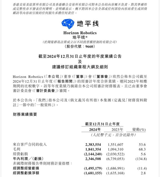 即便如此,地平线去年仍未能实现盈利,公司经调整亏损净额进一步扩大2.8%至16.81亿元。