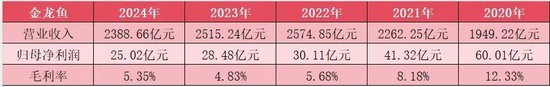 这已经是金龙鱼第二年递交营利“双降”的成绩单了。事实上,自2020年10月上市后的第二年,金龙鱼业绩就已变脸。2021及2022年,金龙鱼营收虽然实现了增长,但净利却不断下滑,呈现增收不增利局面。2023年、2024年,金龙鱼营利“双降”。截至2024年,公司净利已经连跌四年。需要指出的是,金龙鱼的归母净利润已经从上市首年的60.01亿元一路下滑至2024年的25.02亿元,五年累计跌幅超58%。