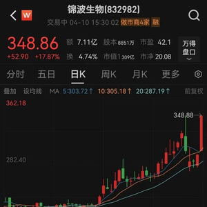 4月10日,锦波生物股价震荡上涨,最终以348.86元收盘,再创历史新高;收盘涨幅为17.87%,最新市值为309亿元。