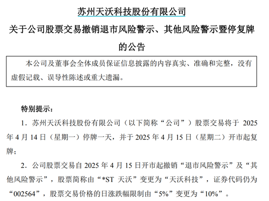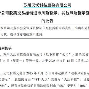 公告显示,公司股票交易自2025年4月15日开市起撤销“退市风险警示”及“其他风险警示”,股票简称由“*ST天沃”变更为“天沃科技”,证券代码仍为“002564”,股票交易价格的日涨跌幅限制由“5%”变更为“10%”。