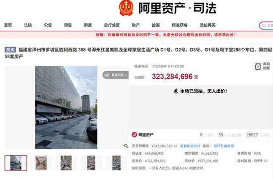 阿里司法拍卖网站显示,4月10日,漳州红星美凯龙全球家居生活广场部分资产以3.23亿元价格公开拍卖,该资产涵盖了红星美凯龙南馆(红星・美凯龙家具馆)、北馆(起居生活馆)、一栋五层办公楼,以及地下室的部分车位,其建筑面积总计102081.58平方米,评估价值达5.77亿元,拍卖价实际降幅达44%,虽有26000多人围观,但最终依然流拍。