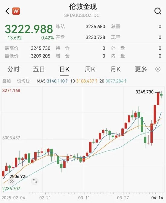 4月14日,现货黄金价格一度突破3245美元/盎司,金价再创历史新高。