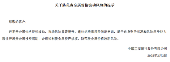 随着金价波动加剧,多家金融机构提示相关风险。3月3日,工商银行发布关于防范贵金属价格波动风险的提示称,近期贵金属价格持续波动,市场风险显著提升。建议投资者提高风险防范意识,基于自身财务状况和风险承受能力理性开展贵金属投资活动,合理控制贵金属资产规模,防范贵金属价格波动风险。